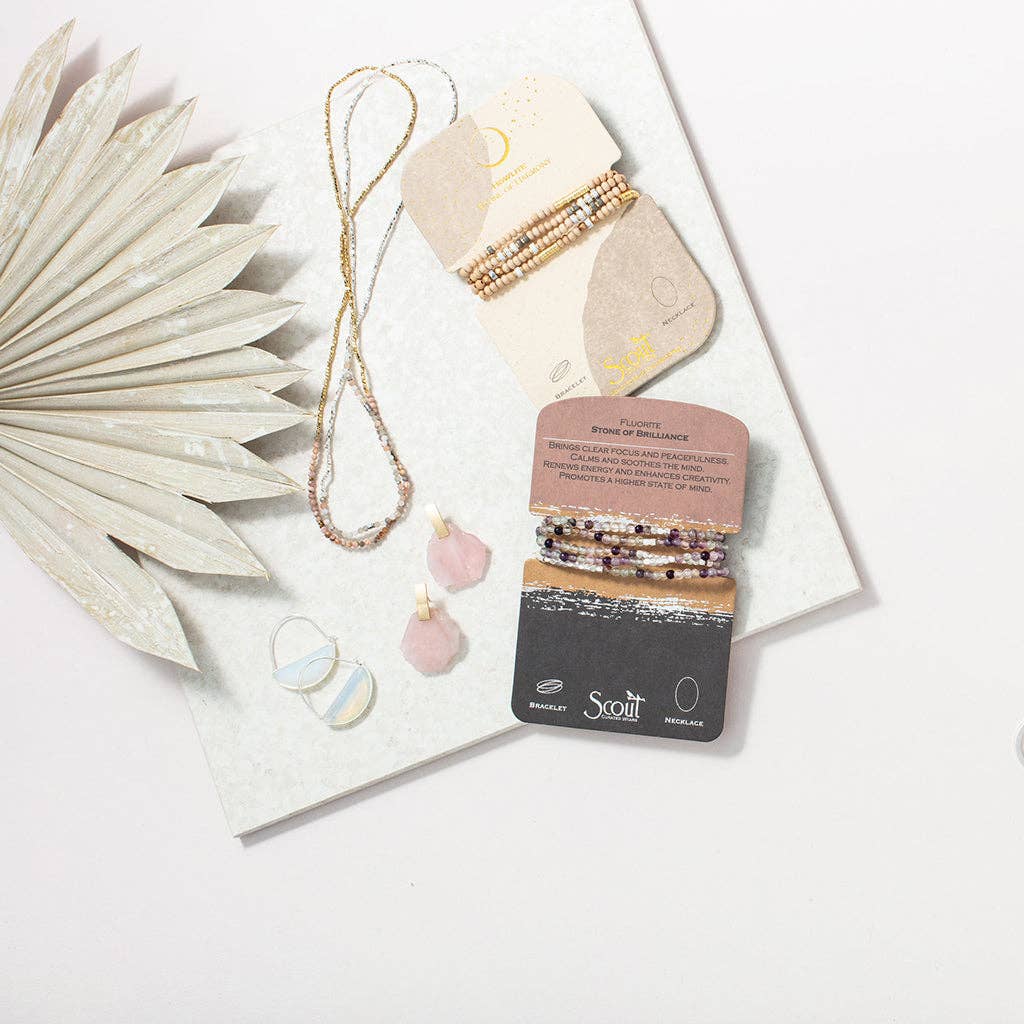 Bracelet becomes a necklace & Ta-Da! Tap into the energies of the earth. Semi precious gemstones adorn wrist & neckline. Effortlessly converts from bracelet to necklace. Can be wrapped 4-5 times as a bracelet and 1-2 times as a necklace. • 34" length • Materials: 4.5mm semi precious stone beads, plated brass, stretch cord • Presented on cards that tell the meaning of each stone: Rhodonite | Stone of Healing. Opens the heart to love and giving. Is centering, restoring, and empowering. Balances emotions and nurtures the soul. Discover the perfect jewelry pieces to complement your style this spring and summer. Makes for a wonderful birthday, graduation, or Mother's Day gift.