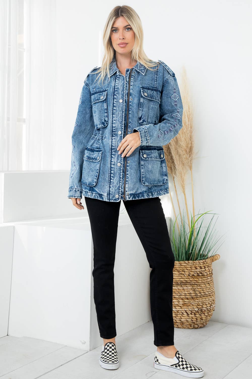 Anorak Jacket Long Sleeves Denim Fabric Stoned Washed & 4 Pockets Aztec Embroidery Detail Front Zip Up & Snap Buttons Drawcord at Waist Model Size: Height: 5'10 / Bust: 34" / Waist: 24" Model Is Wearing Size: Small Bust: 42 1/2" Length: 29 3/4"