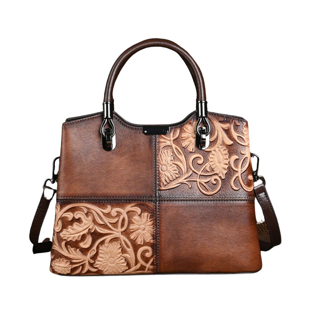 The Modenaire bag is detailed with diagonal embossed design. Features two tone, zipper closure, small round strap, long straps, and leather material hand bag.